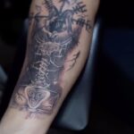Tetování smrt, kostlivec, lebka a růže, lebka s korunou, karty, esa, rukáv