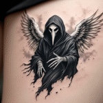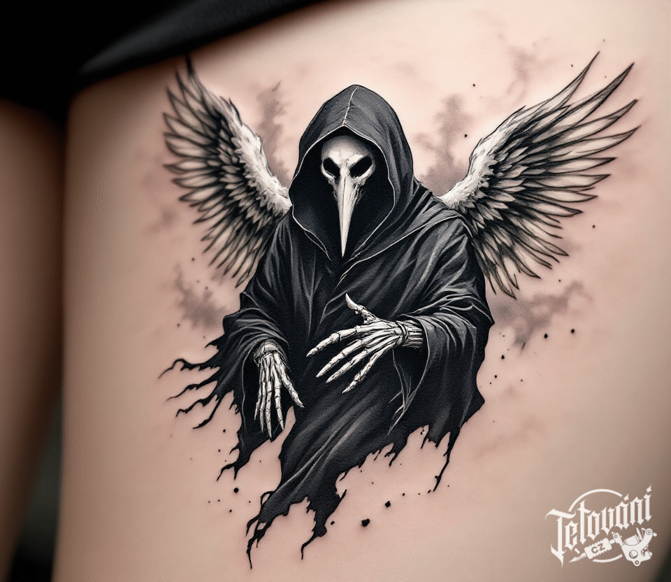 Tetování smrt, kostlivec, morový doktor s křídly na stehně