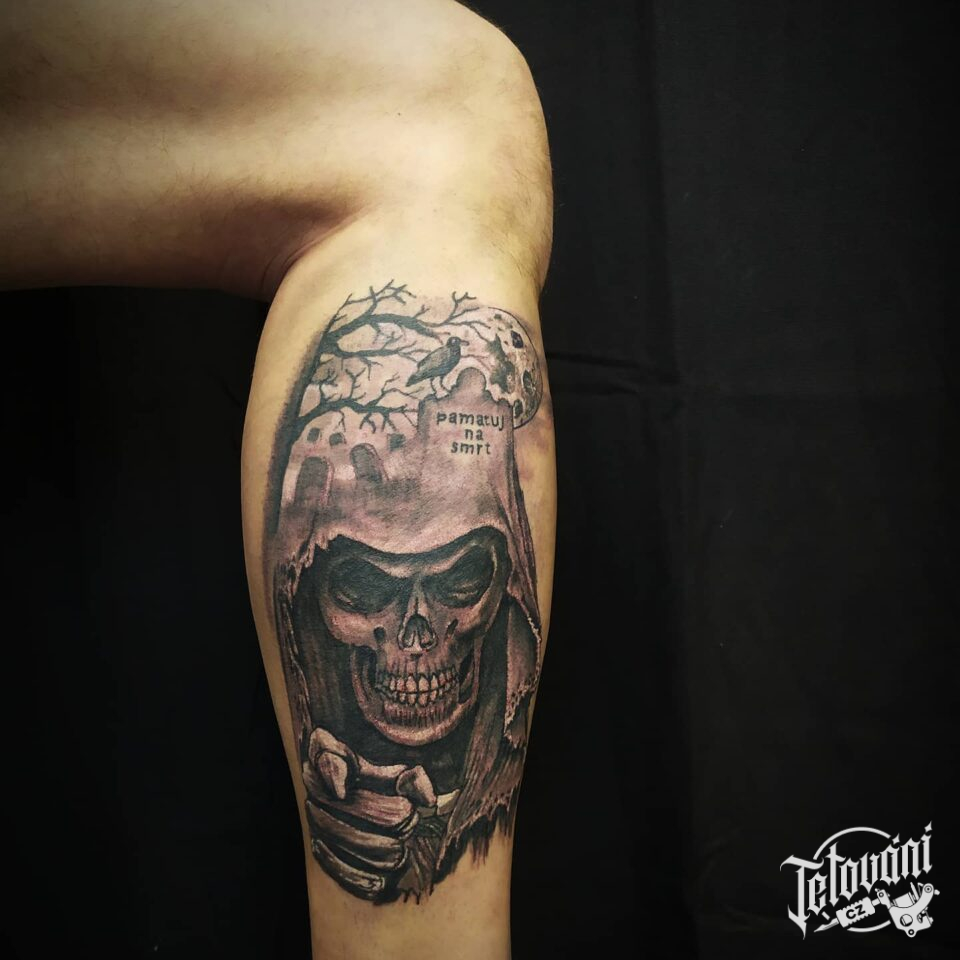 Tetování smrt, kostlivec na lýtku