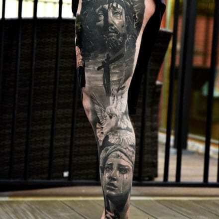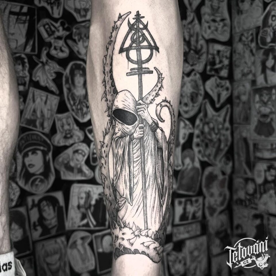 Tetování smrt, kříž, znaky a symboly na předloktí