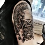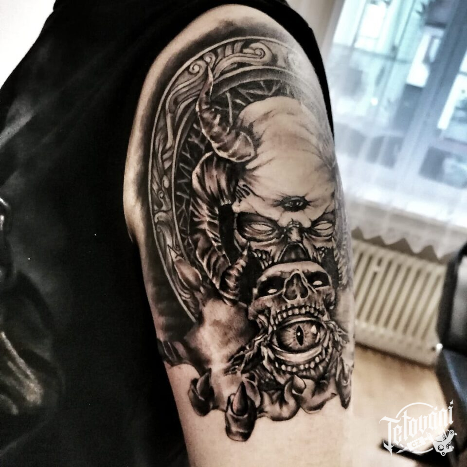 Tetování smrt, lebka, ďábel na rameni