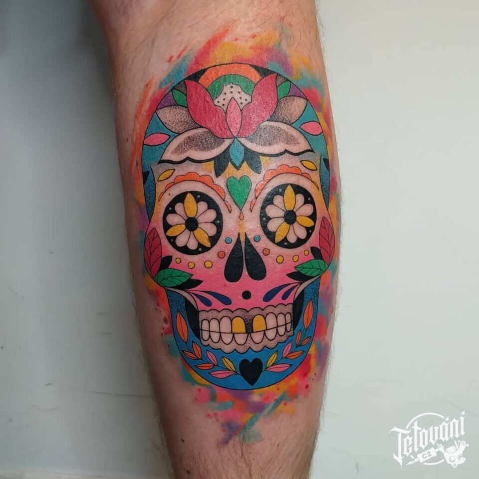 Tetování smrt, lebka muerte na lýtku