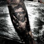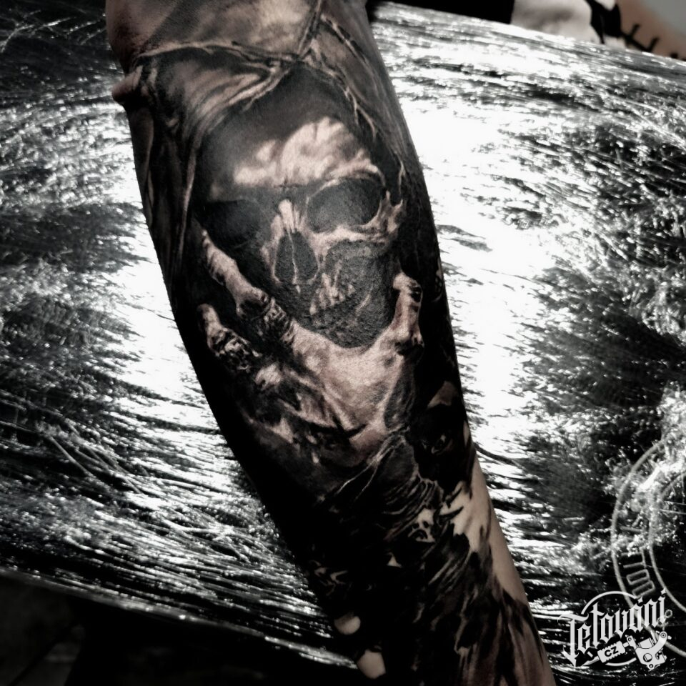 Tetování smrt, lebka s rukou na předloktí