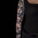 Tetování smrt, portrét ženy muerte, lebka a zvíře netopýr, rukáv