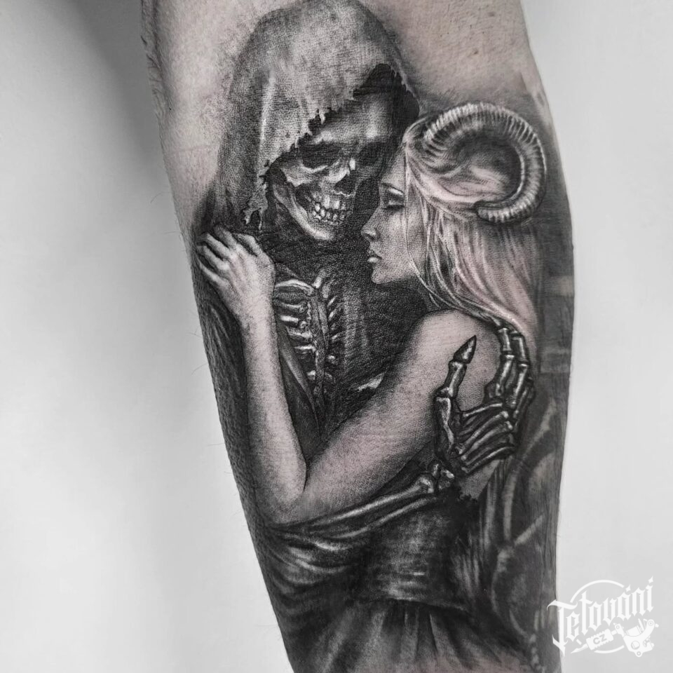 Tetování smrtka a žena beran znamení zvěrokruhu na předloktí