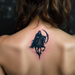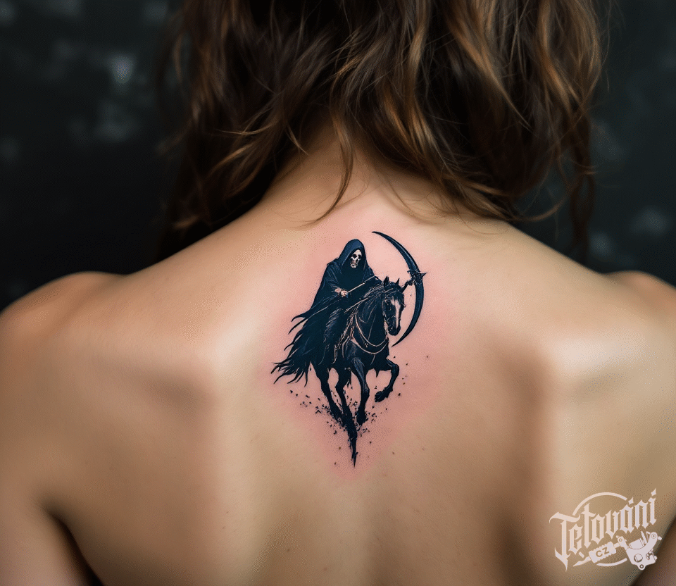 Tetování smrtka na koni mezi lopatkami