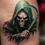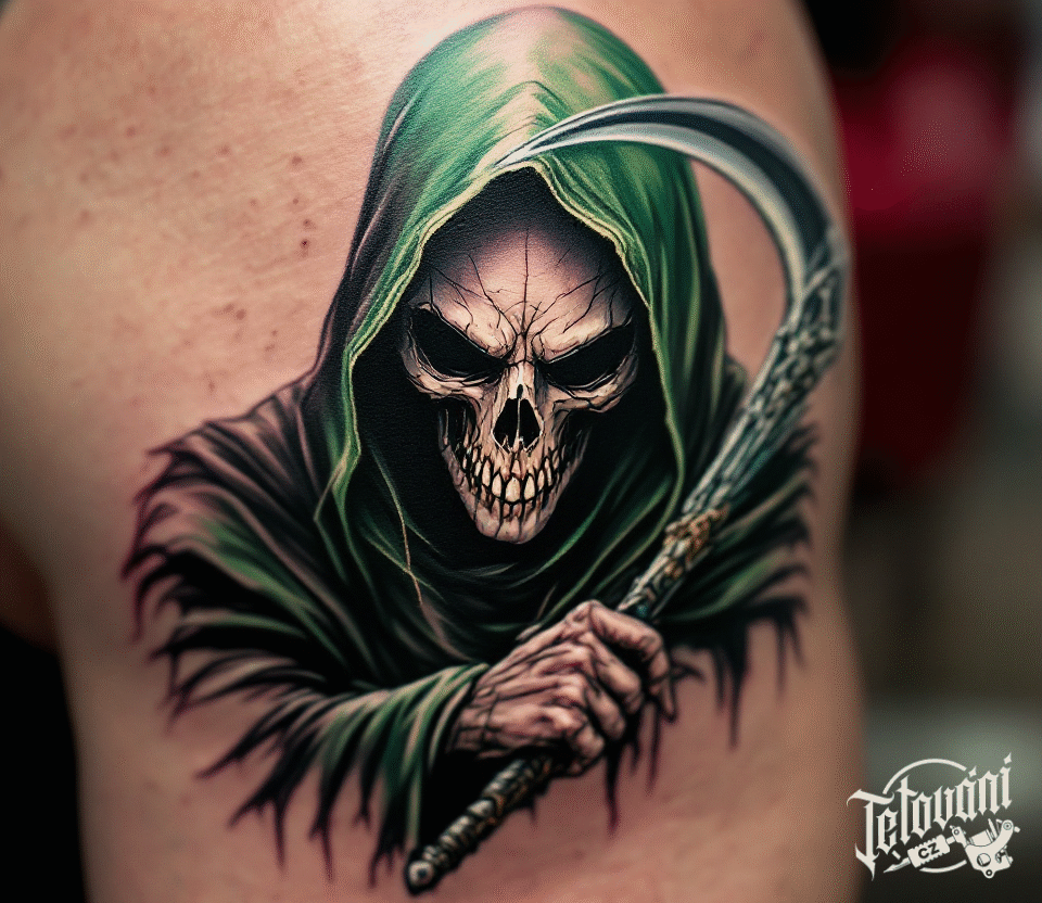 Tetování smrtka s kosou a se zelenou kápí na rameni