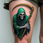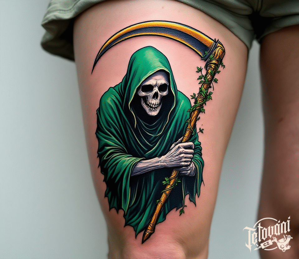 Tetování smrtka s kosou a zelenou kápí na stehně