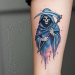 Tetování smrtka s kosou a modrou kápí na předloktí