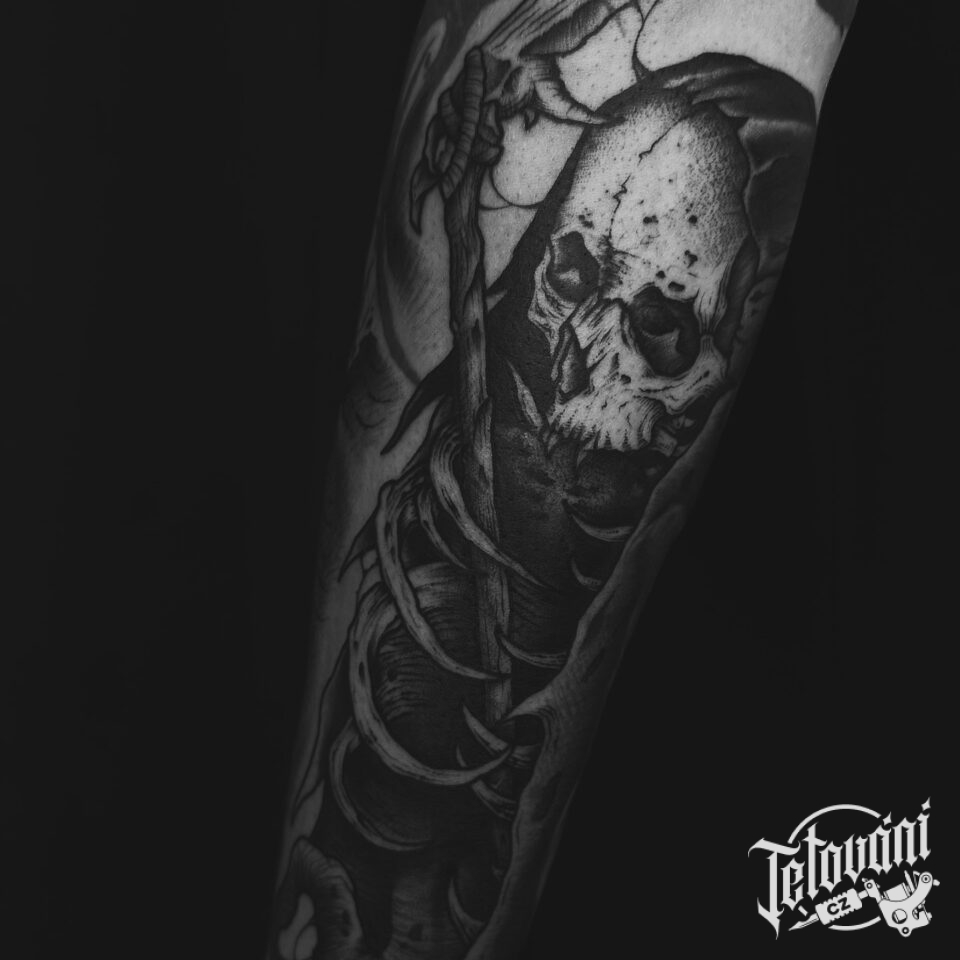 Tetování smrtka s kosou na předloktí
