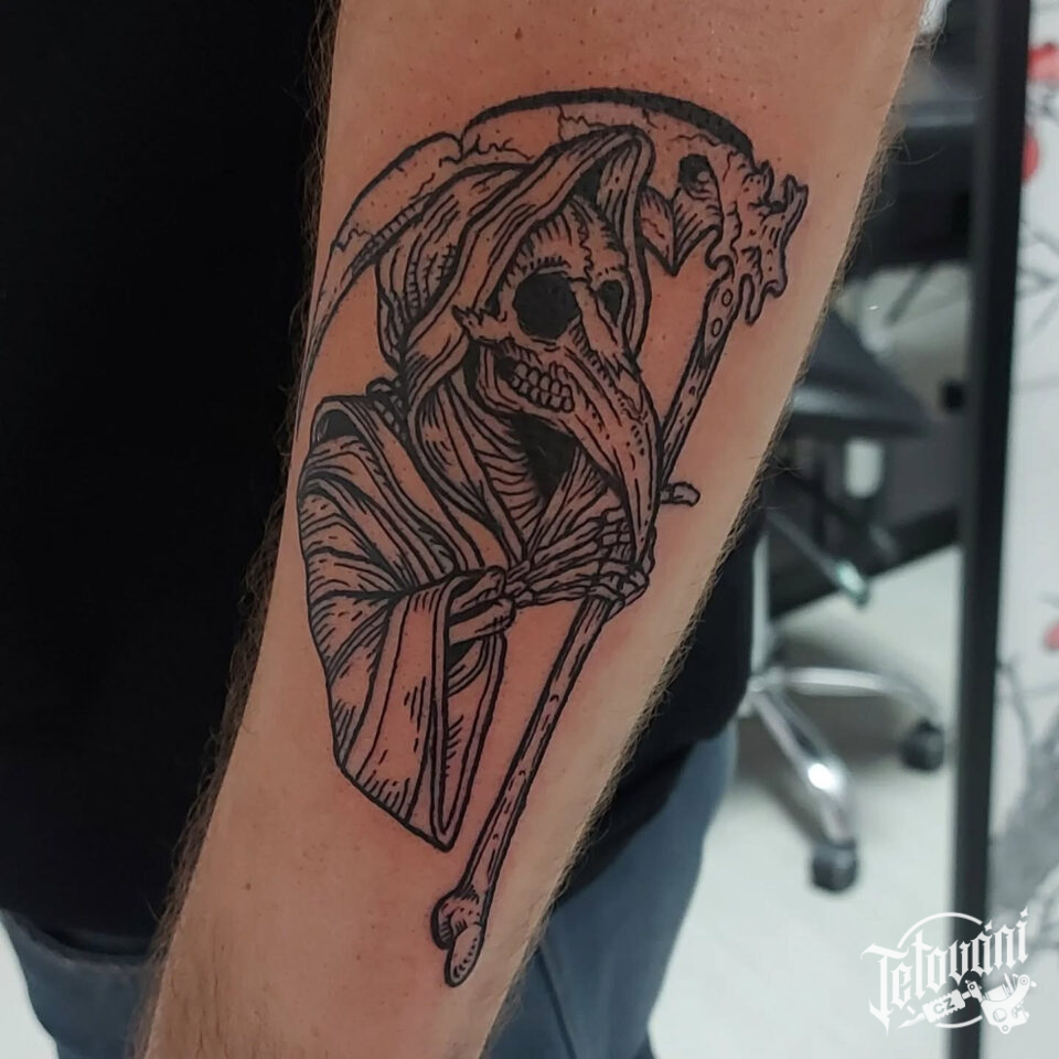Tetování smrtka s kosou na předloktí