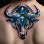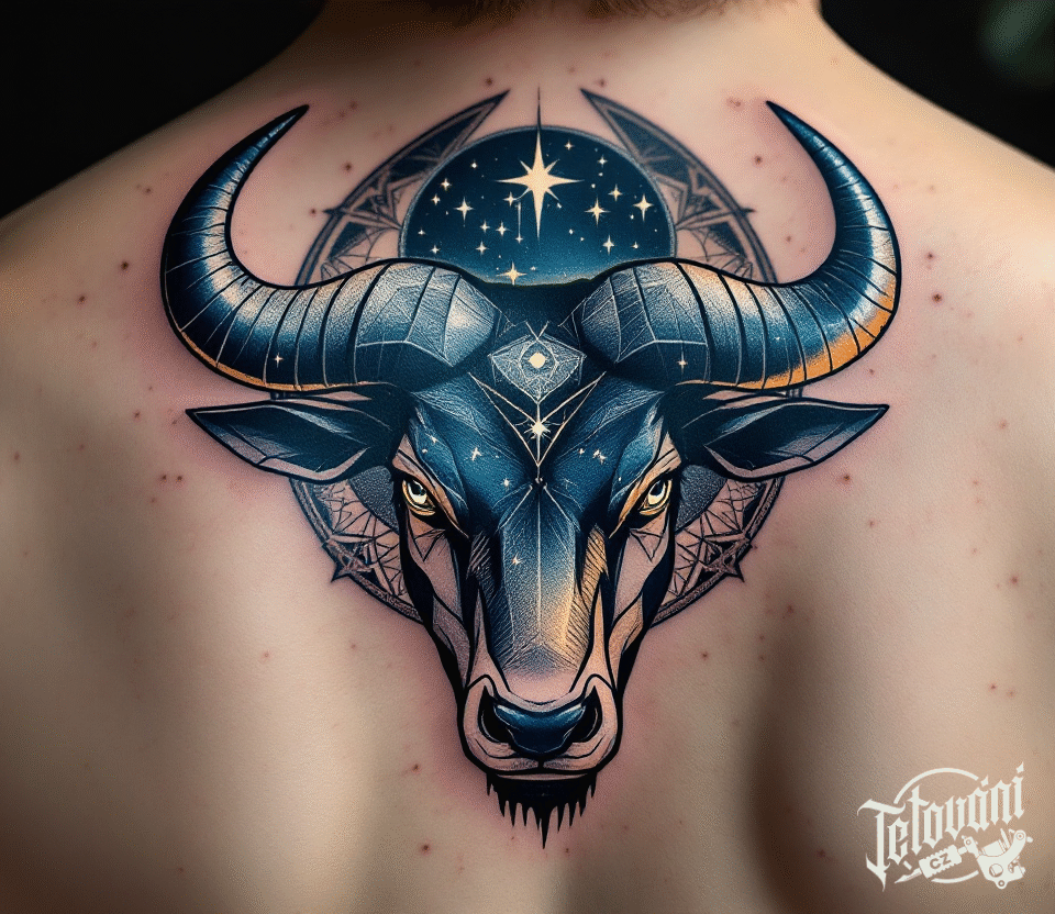 Tetování souhvězdí býka, znamení zvěrokruhu, hlava býka mezi lopatkami