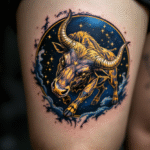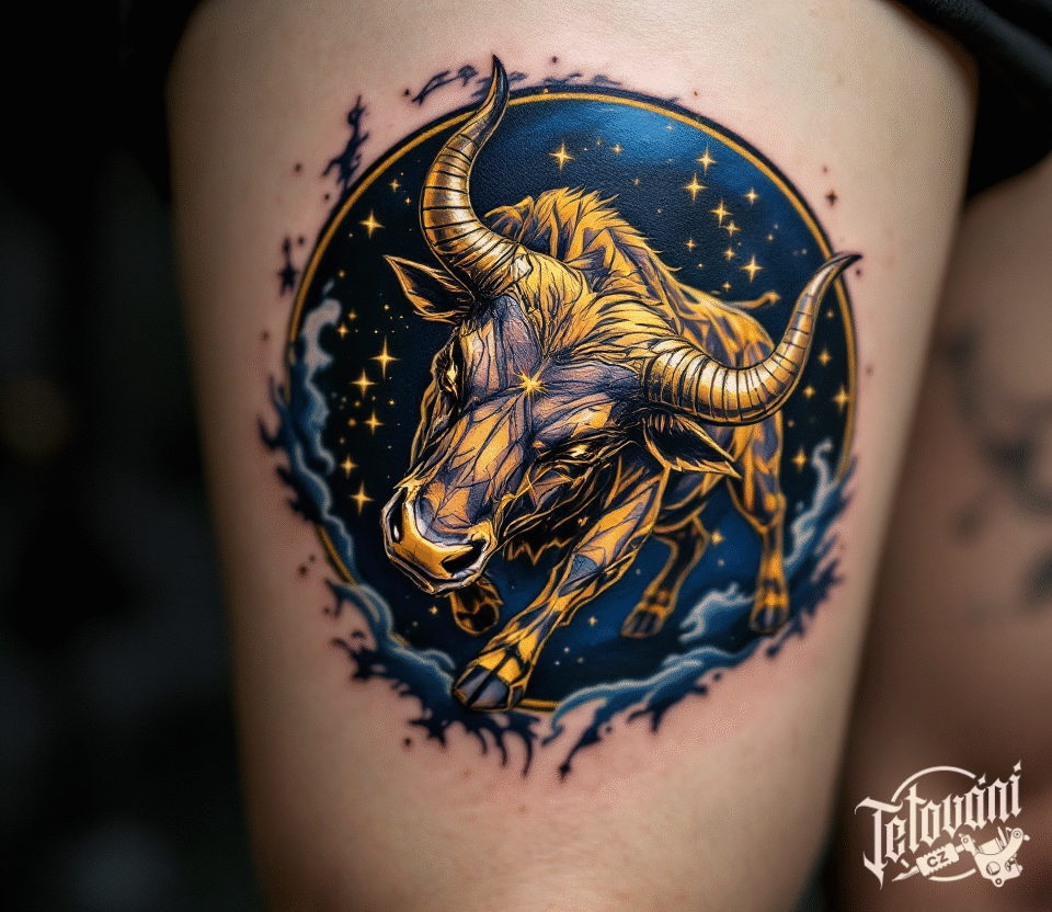 Tetování souhvězdí býka, zvíře, pozlacený býk na stehně