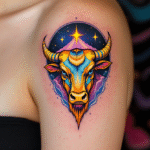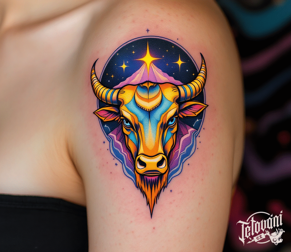 Tetování souhvězdí býka, zvíře, znamení zvěrokruhu, hlava býka na rameni