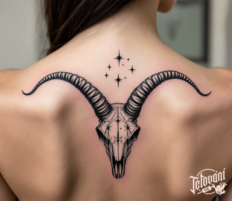 Tetování souhvězdí kozoroha, lebka mezi lopatkami