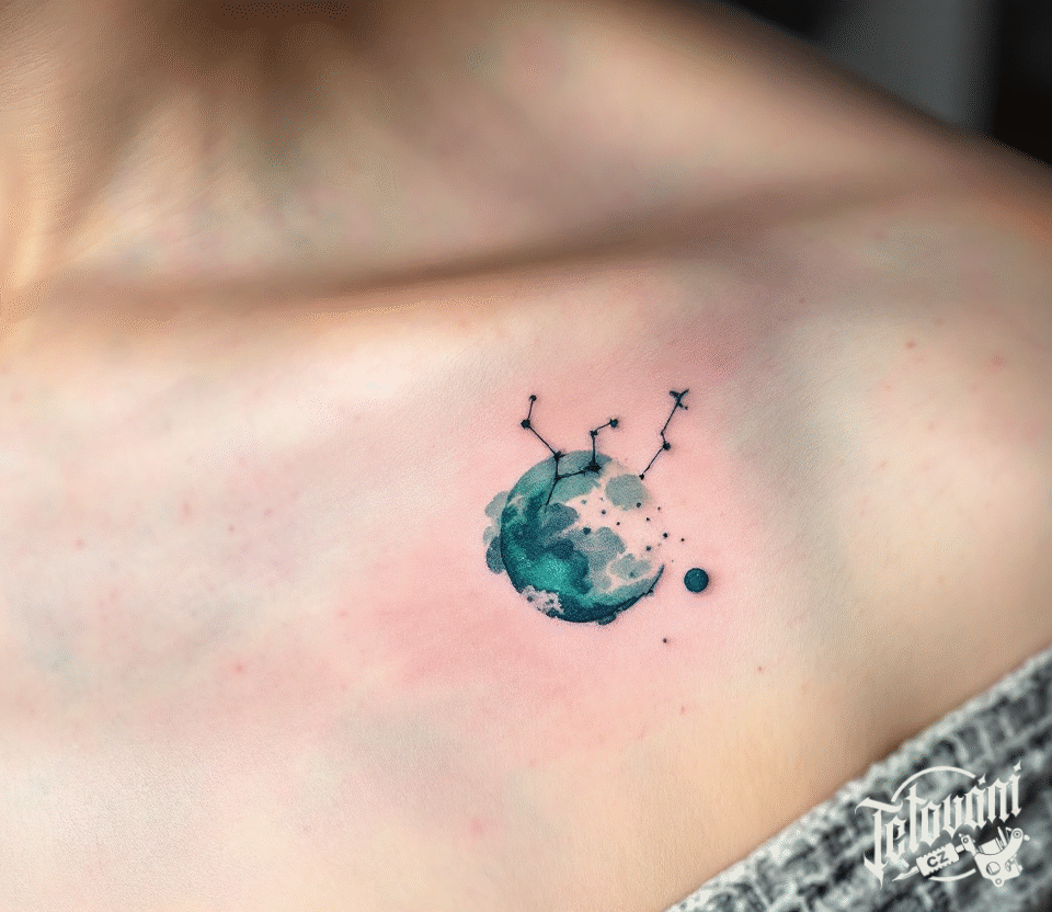 Tetování souhvězdí panny, znamení zvěrokruhu pod klíční kost