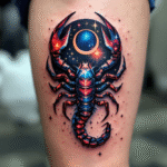 Tetování souhvězdí štír, zvíře škorpion, hvězdy a Měsíc, znamení zvěrokruhu na boku stehna