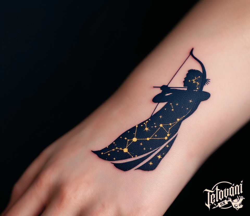 Tetování souhvězdí střelce, střelec se šípem na hřbet ruky