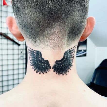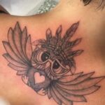Tetování sova s křídly, pírka, srdce na záda