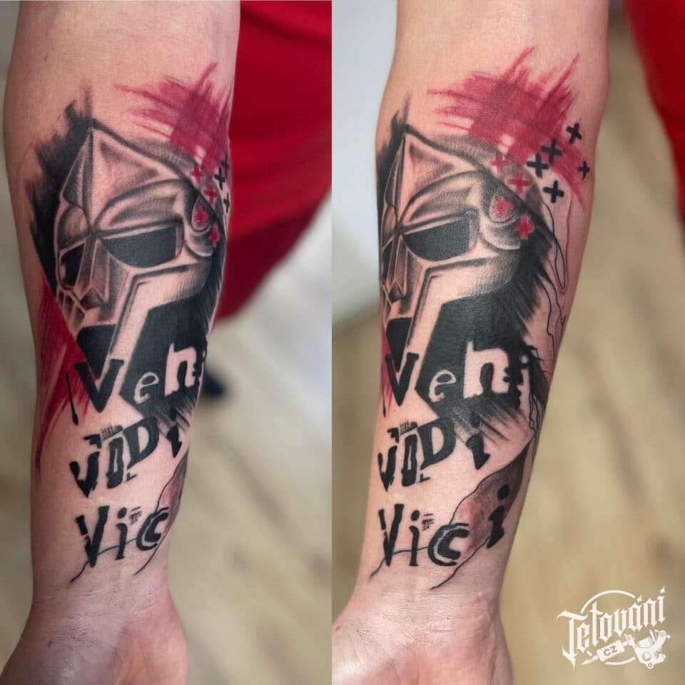 Tetování sparťanský bojovník, nápis na předloktí