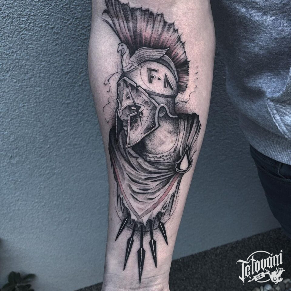 Tetování sparťanský bojovník, písmena, symboly na předloktí