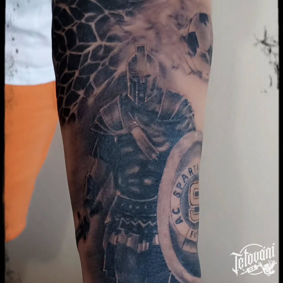 Tetování sparťanský bojovník. Sparta Praha na předloktí