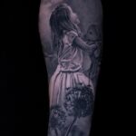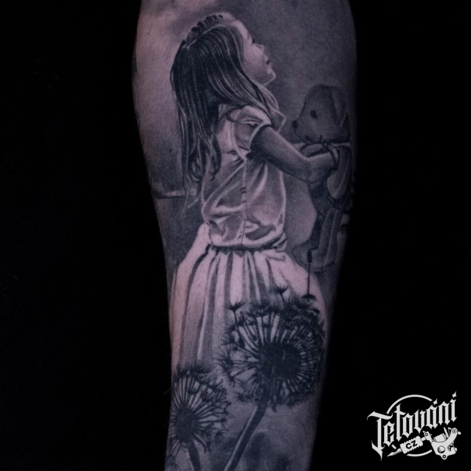 Tetování společná tetování postavička a květiny pampeliška na předloktí