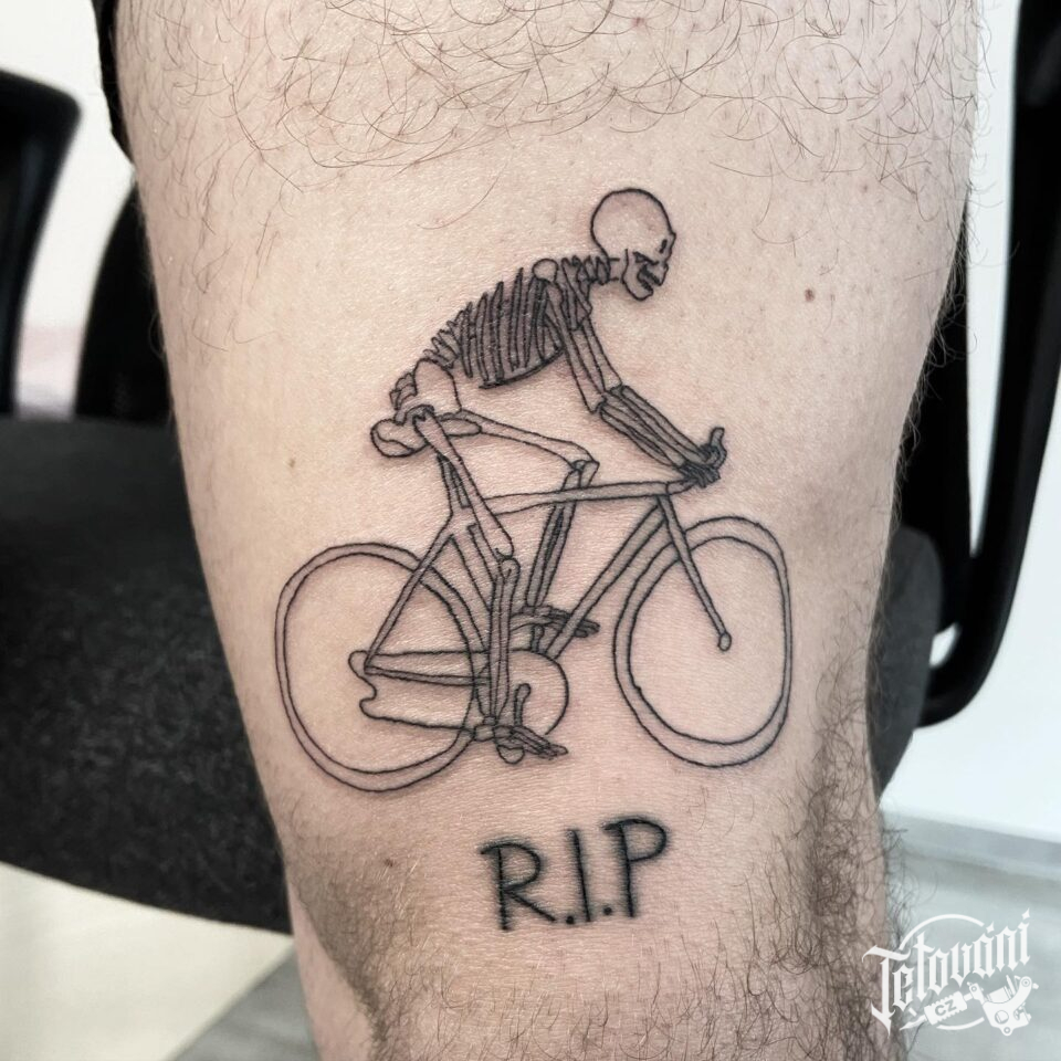 Tetování sport, cyklo, kostlivec na kole na stehně