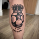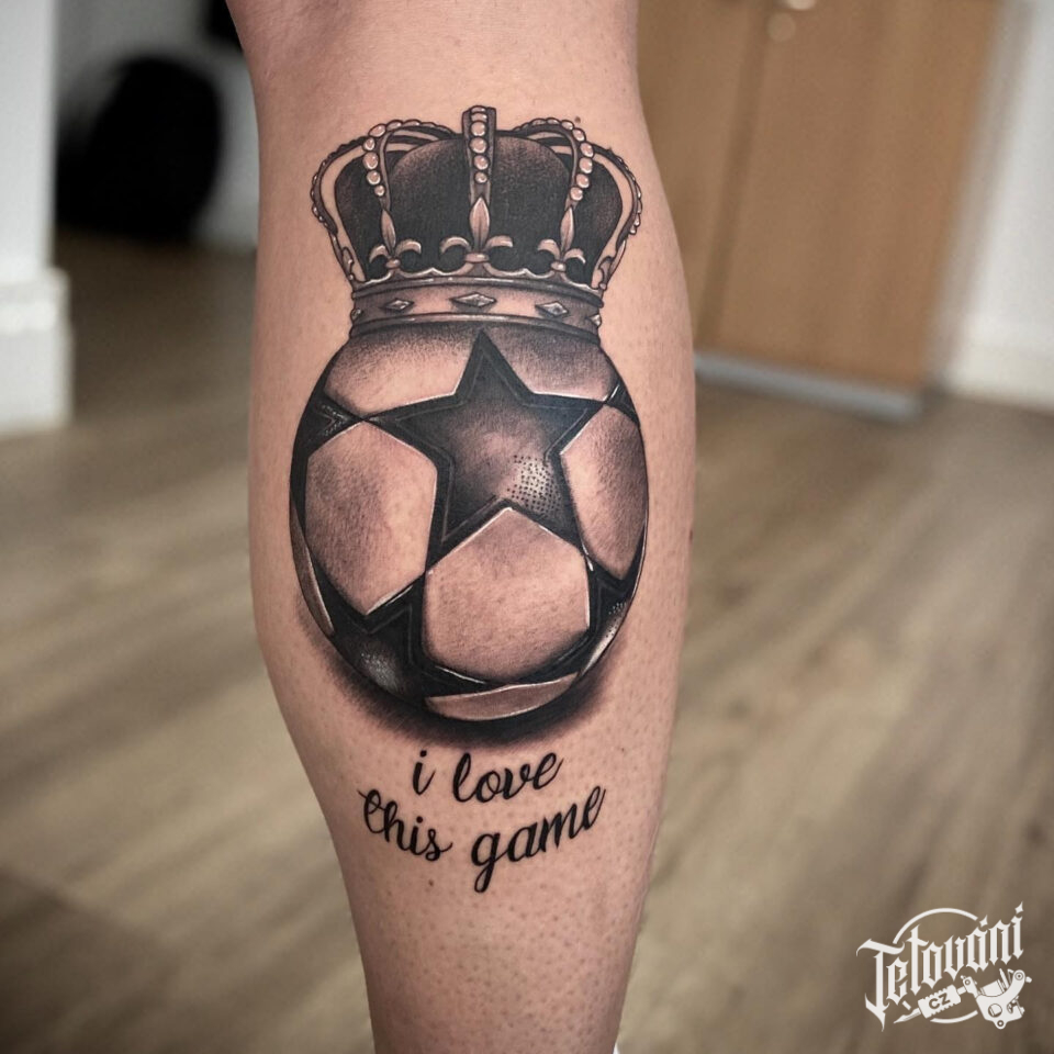 Tetování sport, fotbalový míč s korunou a nápis na lýtku