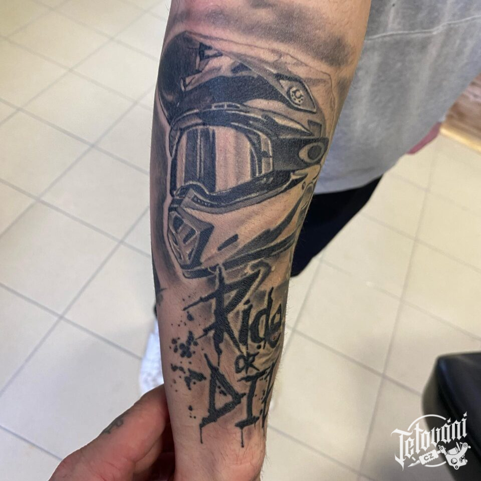 Tetování sport motokros, motorkář v helmě na předloktí