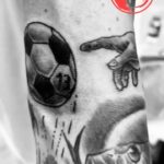Tetování sport, předměty, fotbalový míč a ruka na paži