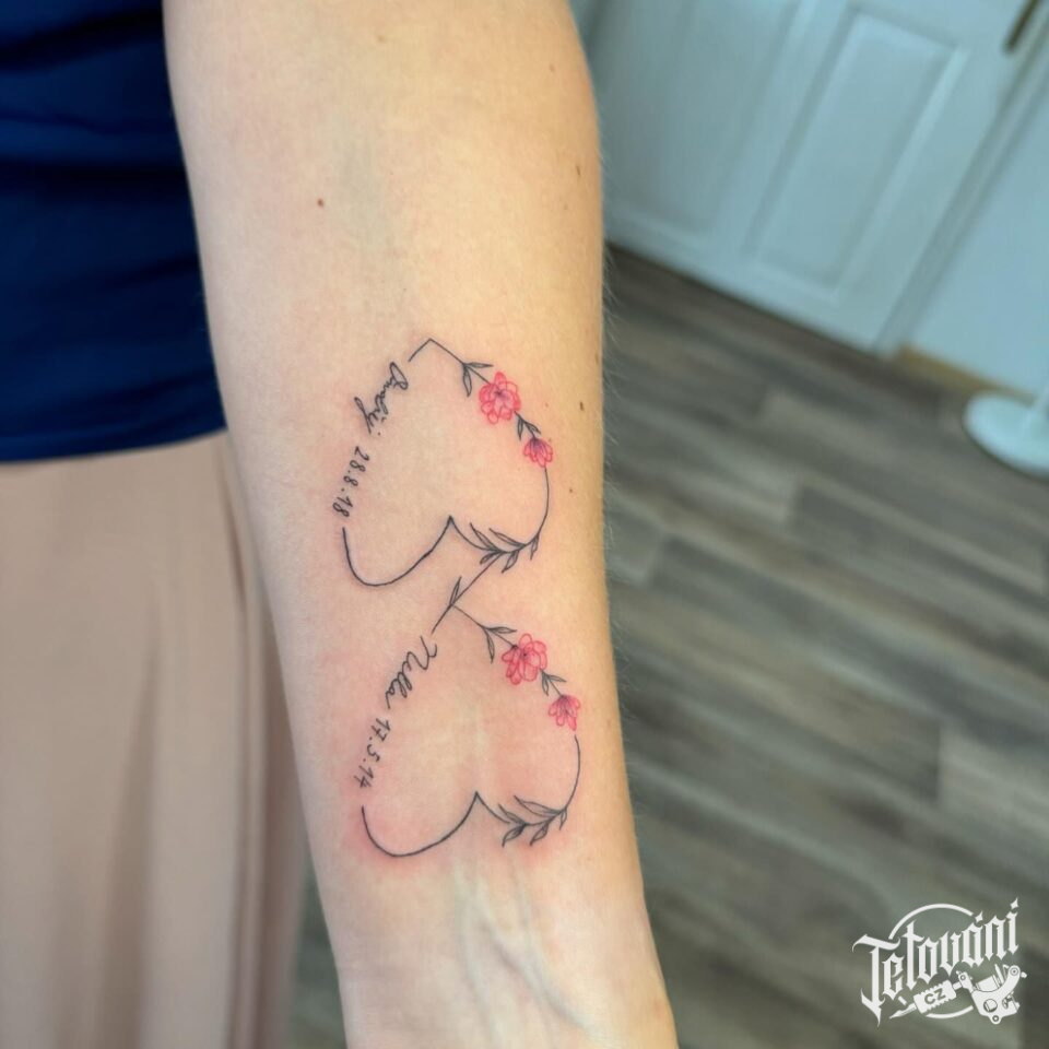 Tetování srdce a květiny na předloktí