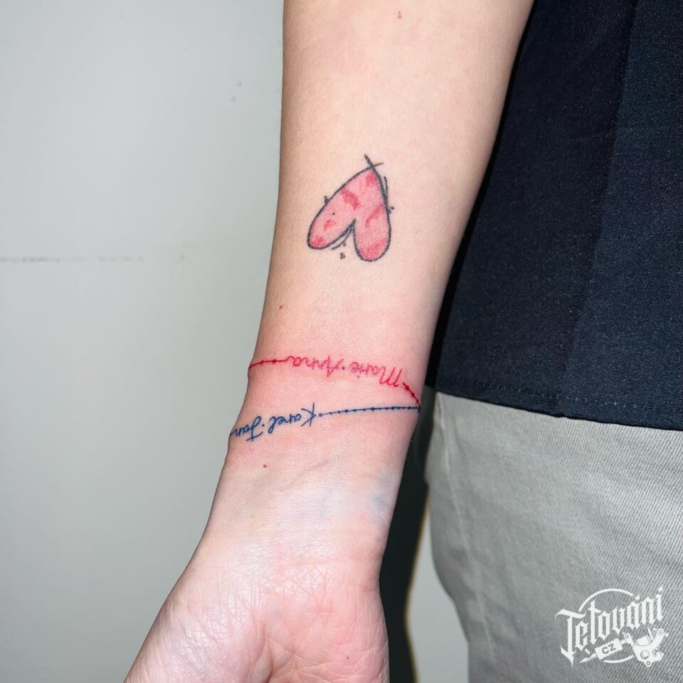 Tetování srdce a náramky s nápisem na předloktí