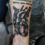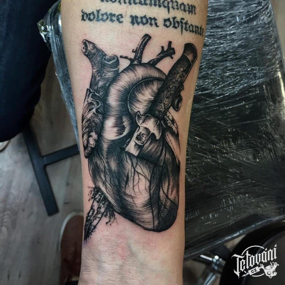 Tetování srdce a znaky a symboly, nůž na předloktí