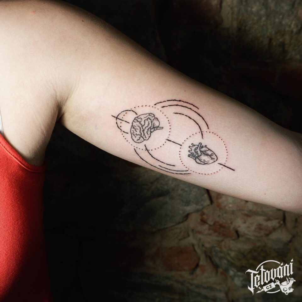 Tetování srdce, čáry a znaky a symboly mozek na paži