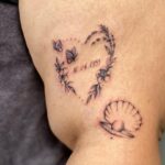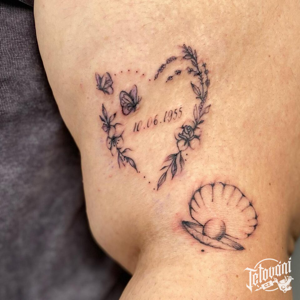 Tetování srdce, datum, nápis na rameno