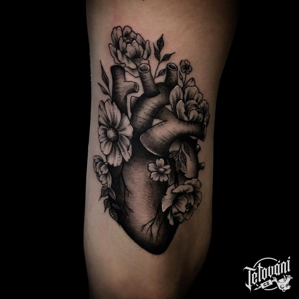 Tetování srdce, květiny na paži