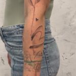 Tetování srdce, květiny, nápisy, hvězdy, písmena, čára, datum na lýtku