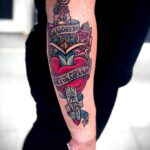 Tetování srdce, meč, květiny, nápisy na předloktí