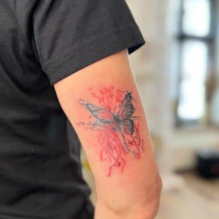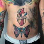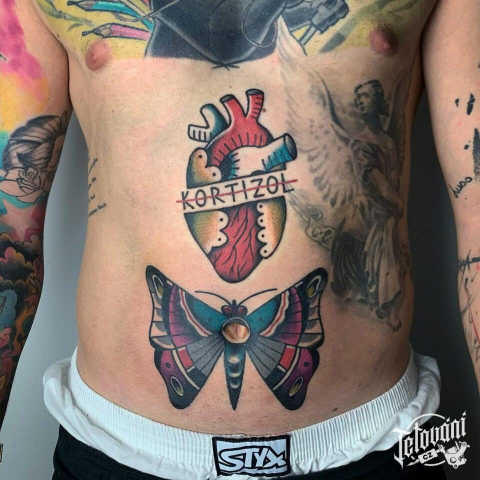 Tetování srdce, motýl na břichu