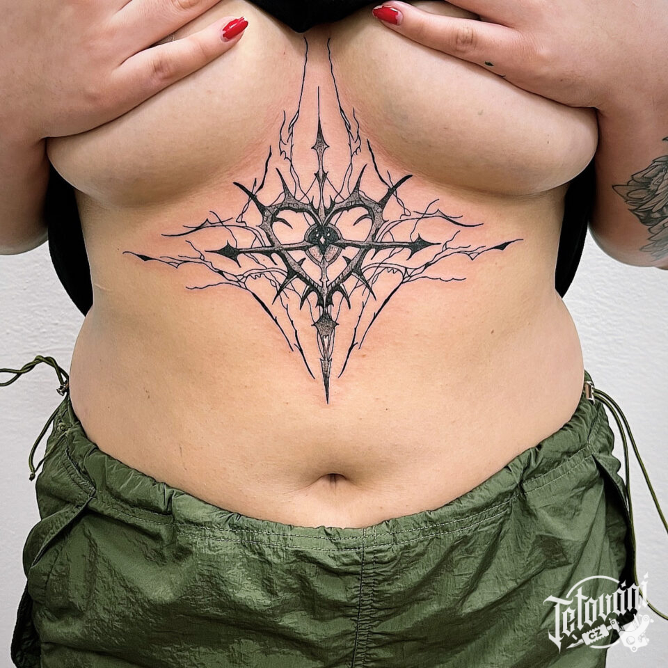 Tetování srdce na břichu mezi prsa