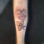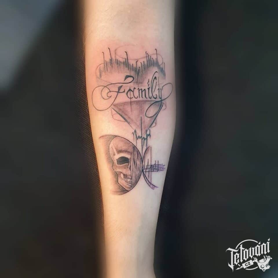 Tetování srdce, nápis, lebka a tep srdce na předloktí