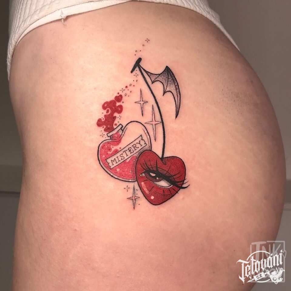 Tetování srdce, oko, hvězdy na zadek