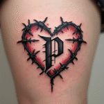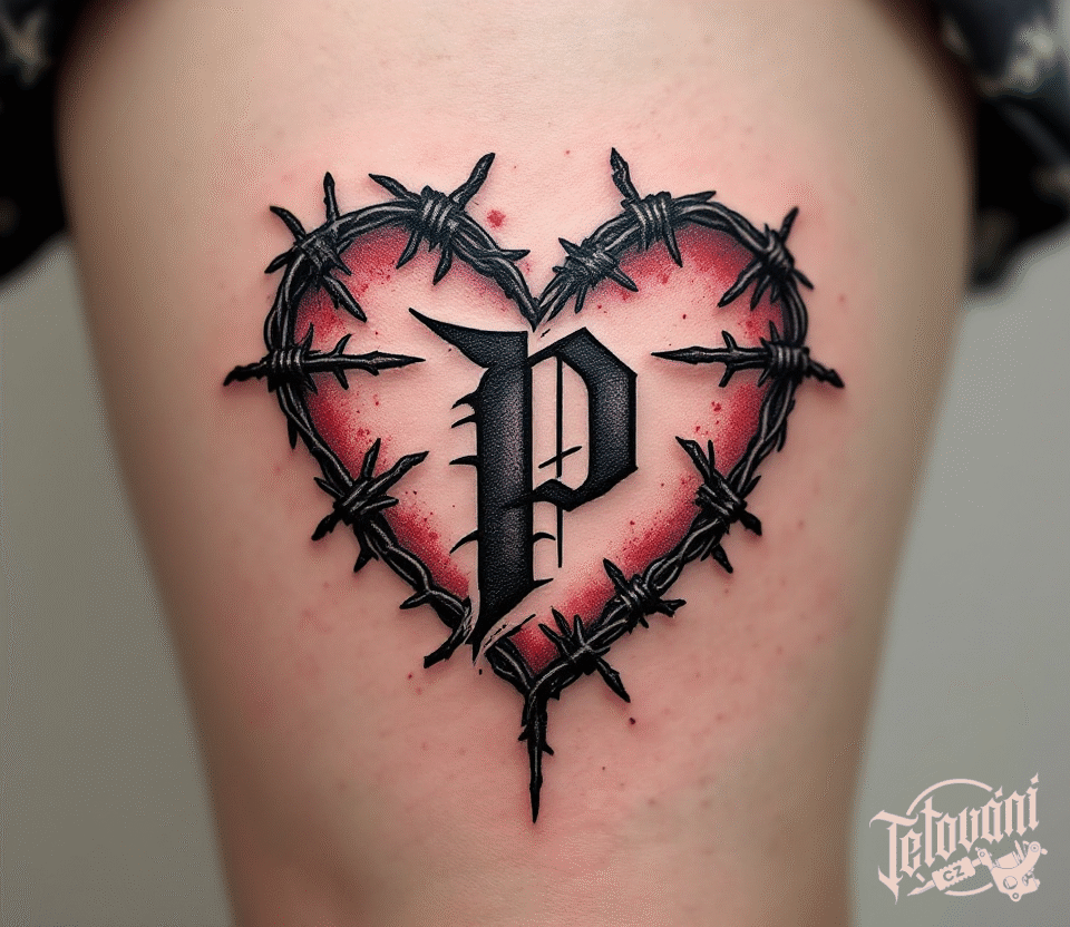 Tetování srdce, ostnatý drát a srdce s písmenem na stehno