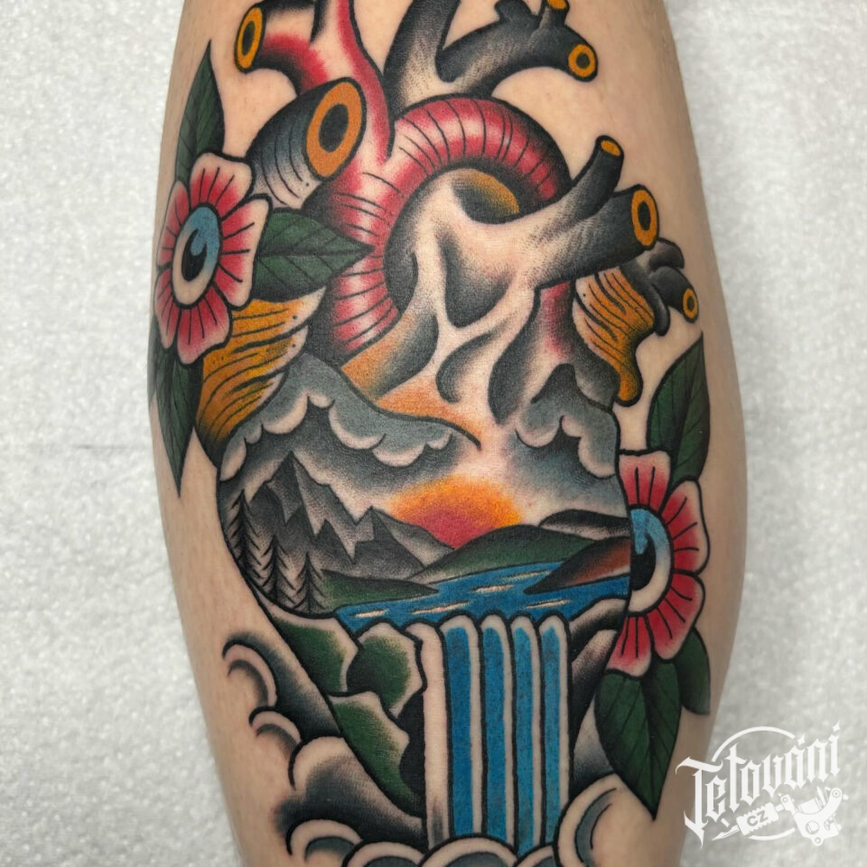Tetování srdce, příroda, moře, hory, květiny na lýtko