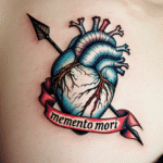 Tetování srdce probodnuté šípem s nápisem memento mori na lopatku