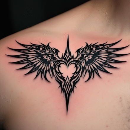 Tetování srdce s křídly, větvičky na klíční kosti