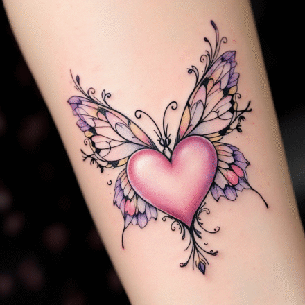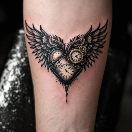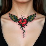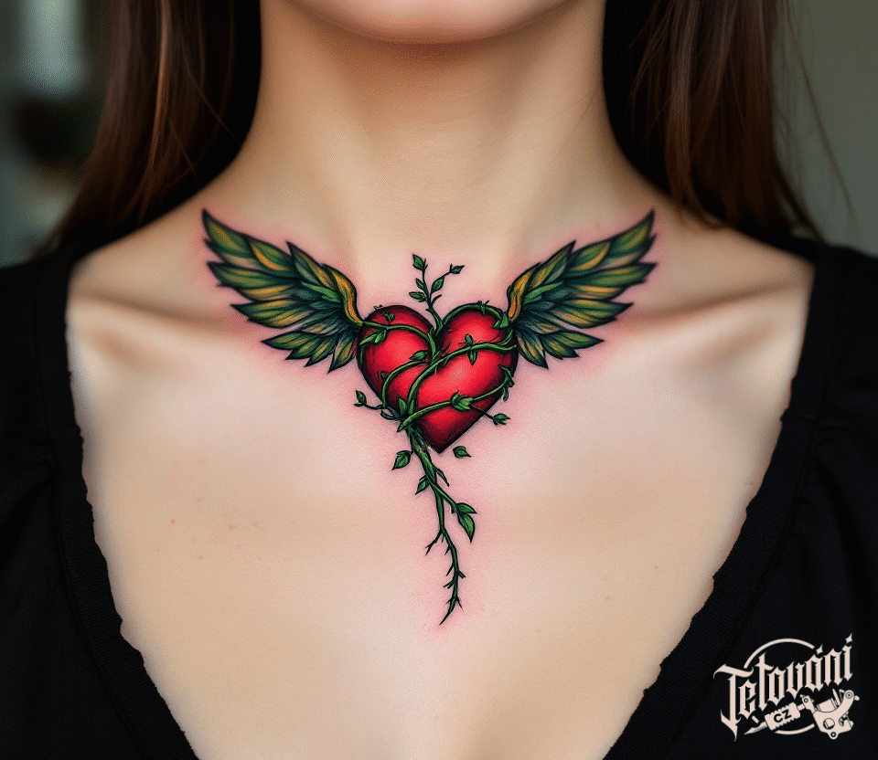 Tetování srdce s křídly, větvičky na klíční kosti