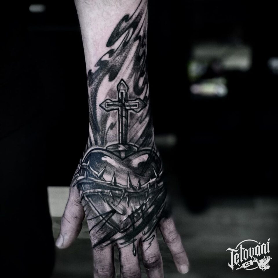 Tetování srdce s ostnatým drátem a křížem na hřbetu ruky