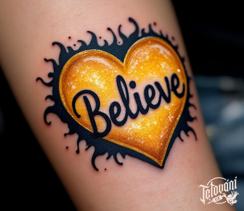Tetování srdce s písmem a nápisem Believe na předloktí